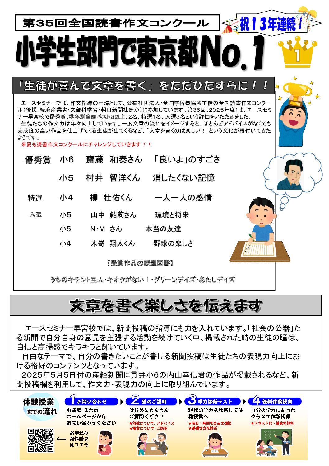 さらに、作文力の向上にも力を入れ、毎年、小学部でチャレンジしている「全国読書作文コンクール」(後援:経済産業省・文部科学省・朝日新聞ほか)では、入選以上の受賞者数で8年連続東京都NO1になっています。