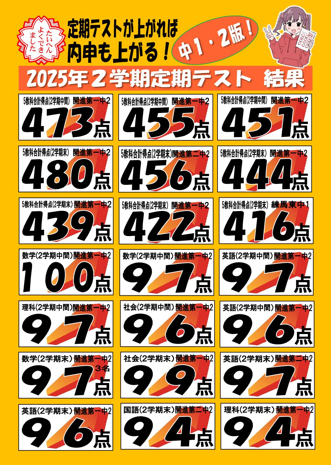 中学部では、勉強と部活の両立を図り、定期試験対策に重点をおきながら、土日・祝日を利用した豊富なテスト対策授業を実施しています。各中学校の出題傾向に即した演習問題を反復し、大きな成果をあげています。