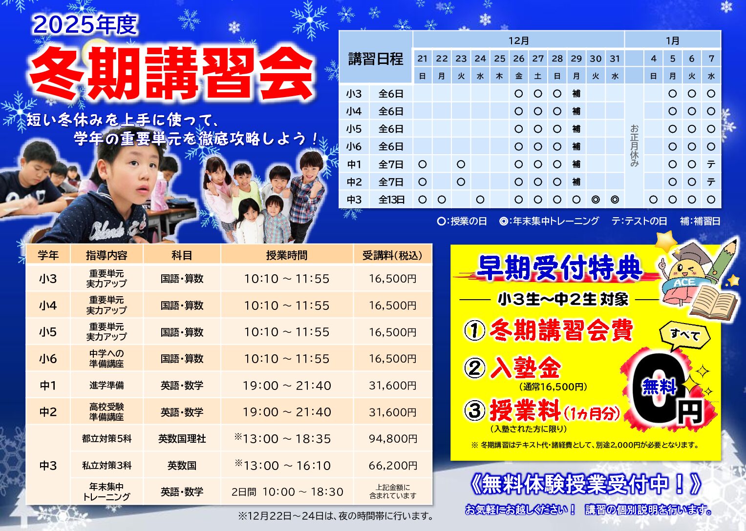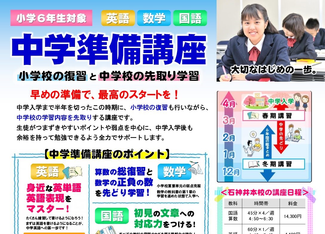 | 中学部 | 中学1年~2年 | 英・数・国 65分×6/週 |